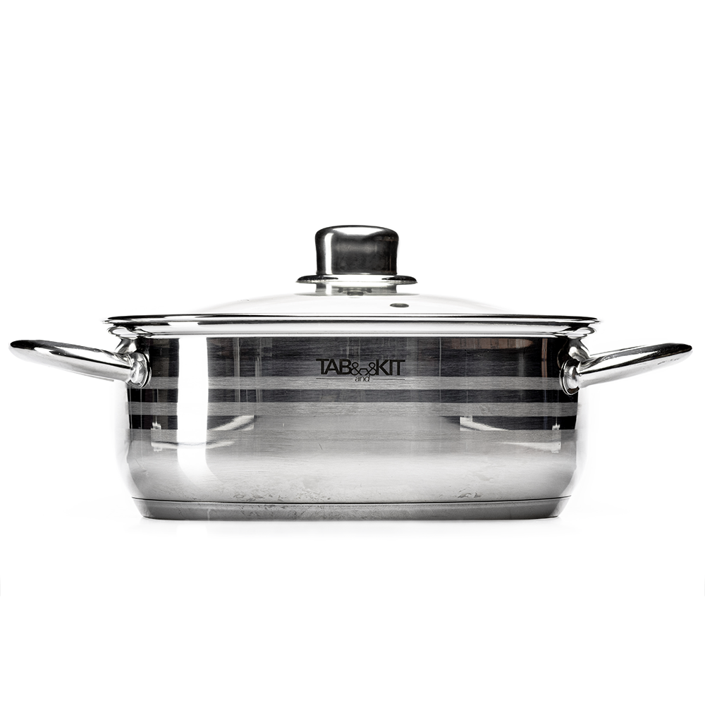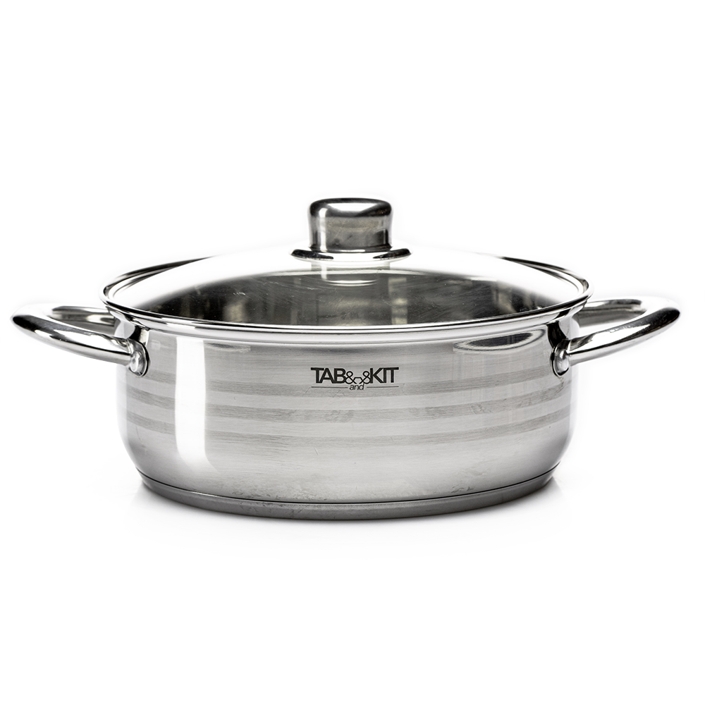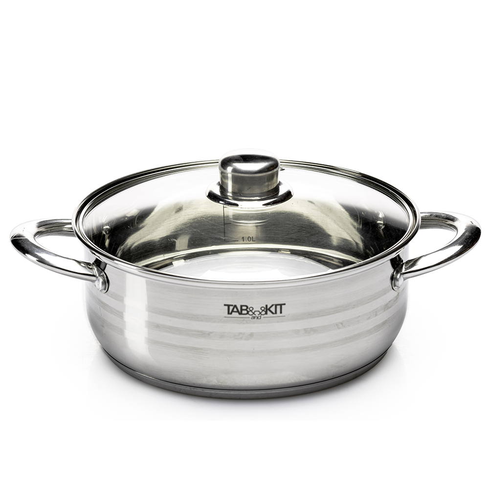 La cacerola Tab and Kit de acero inoxidable es compatible con estufas de inducción, gas y eléctricas. Su diseño práctico facilita el manejo, mientras que su superficie lisa permite una limpieza rápida y sencilla, ya sea a mano o en lavavajillas.