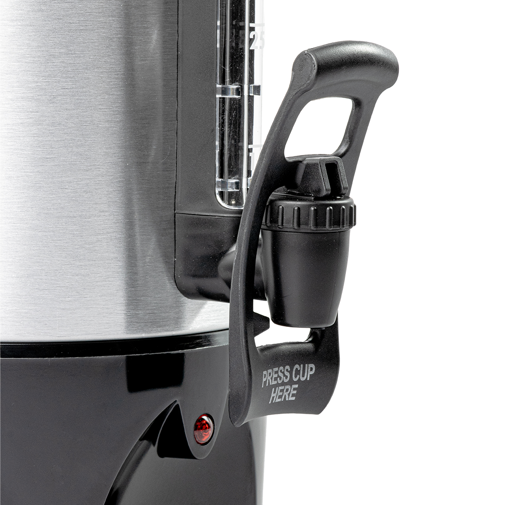 La tapa con seguro de cierre y asas frías al tacto brindan mayor seguridad al manipularla, mientras que su sistema de servicio rápido con una sola mano hace que llenar una taza sea tan fácil como presionar contra la palanca dispensadora.