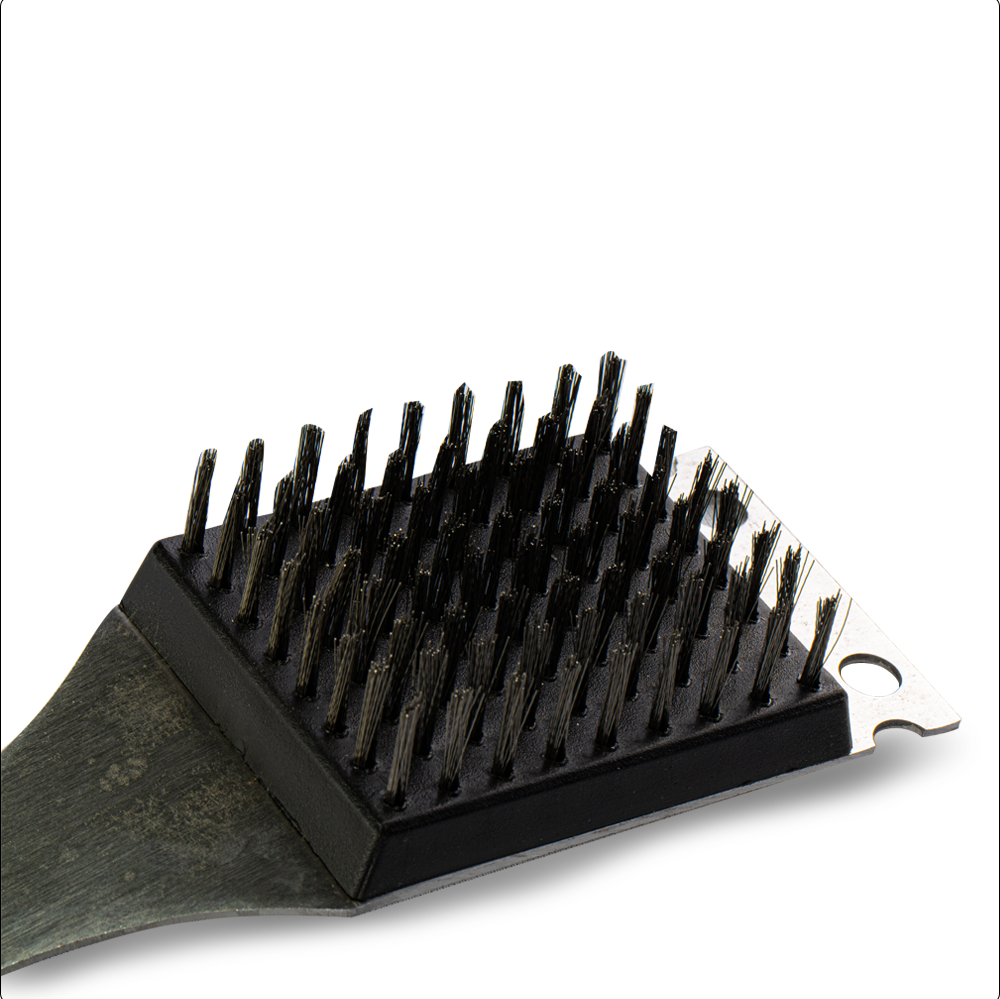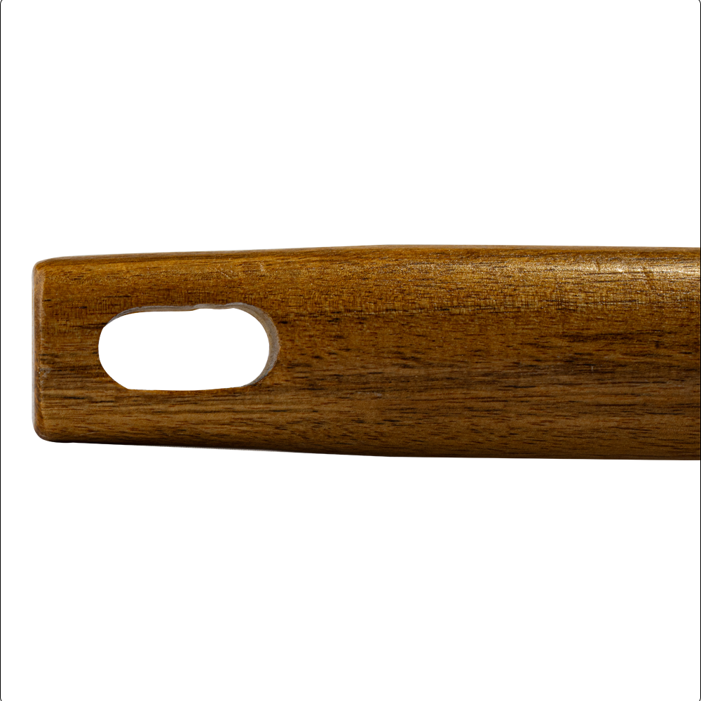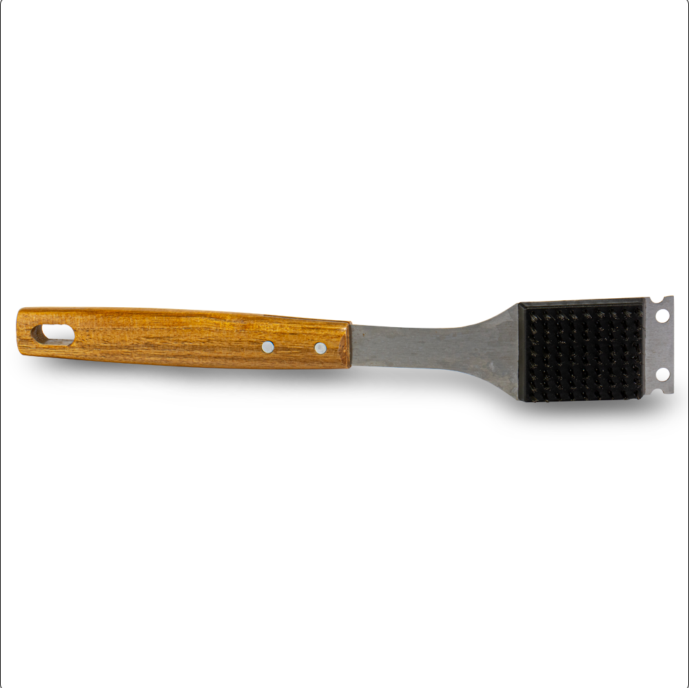 Cuenta con un mango de madera ergonómico, cómodo de sujetar y con acabado natural que brinda seguridad durante el uso. Además, incluye un orificio en el extremo para colgarlo y mantenerlo siempre a la mano, ahorrando espacio en tu cocina o área de asador. El cepillo mide 40 cm de largo, lo que permite limpiar la parrilla de manera segura, evitando el contacto directo con la superficie caliente. En uno de sus extremos integra una navaja metálica, perfecta para raspar residuos difíciles, logrando así una limpieza más completa y sin esfuerzo adicional.