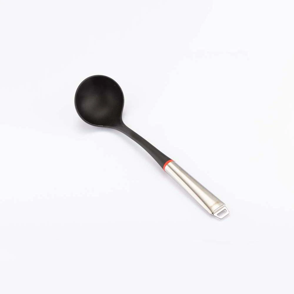 La parte del cucharón está hecha de plástico en color negro, lo que lo hace resistente al calor de hasta 180°C. Esto significa que puedes utilizarlo con total tranquilidad incluso en ollas y sartenes antiadherentes, ya que no raya las superficies.