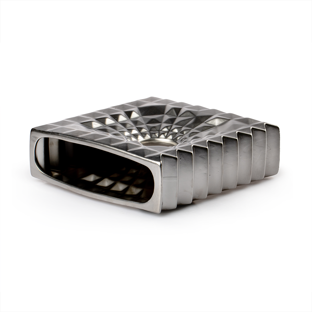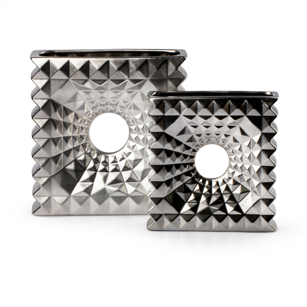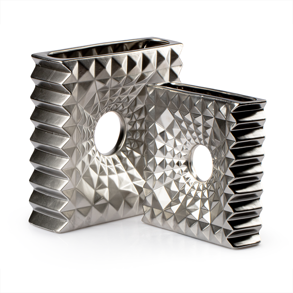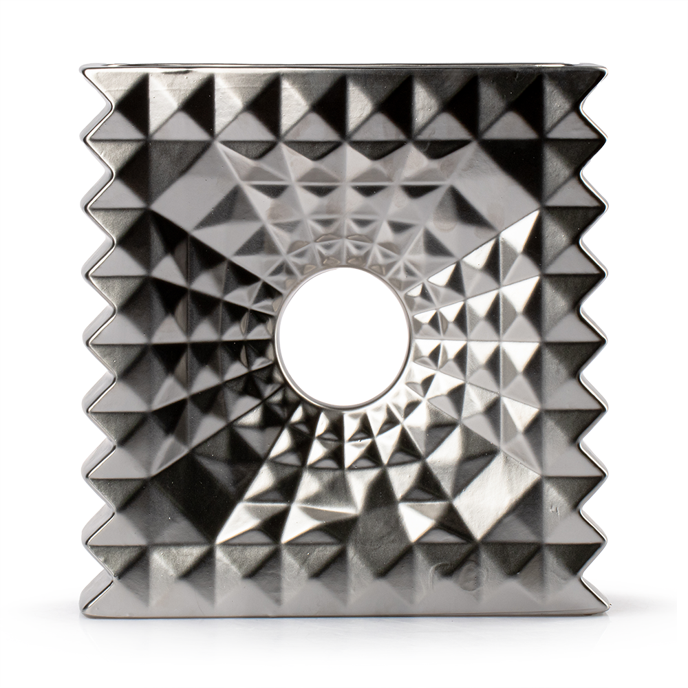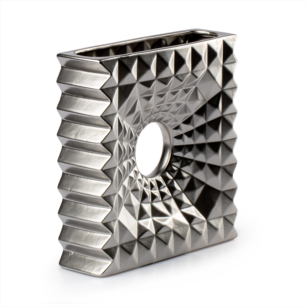 El acabado plateado del Florero Imperial Grande Cerámica Love And Lemons lo hace versátil, desde el minimalismo moderno hasta ambientes más clásicos y elegantes. Su diseño cuadrado con bordes bien definidos transmite orden y equilibrio, mientras que el círculo central añade dinamismo y fluidez visual, logrando una pieza armónica y llamativa.