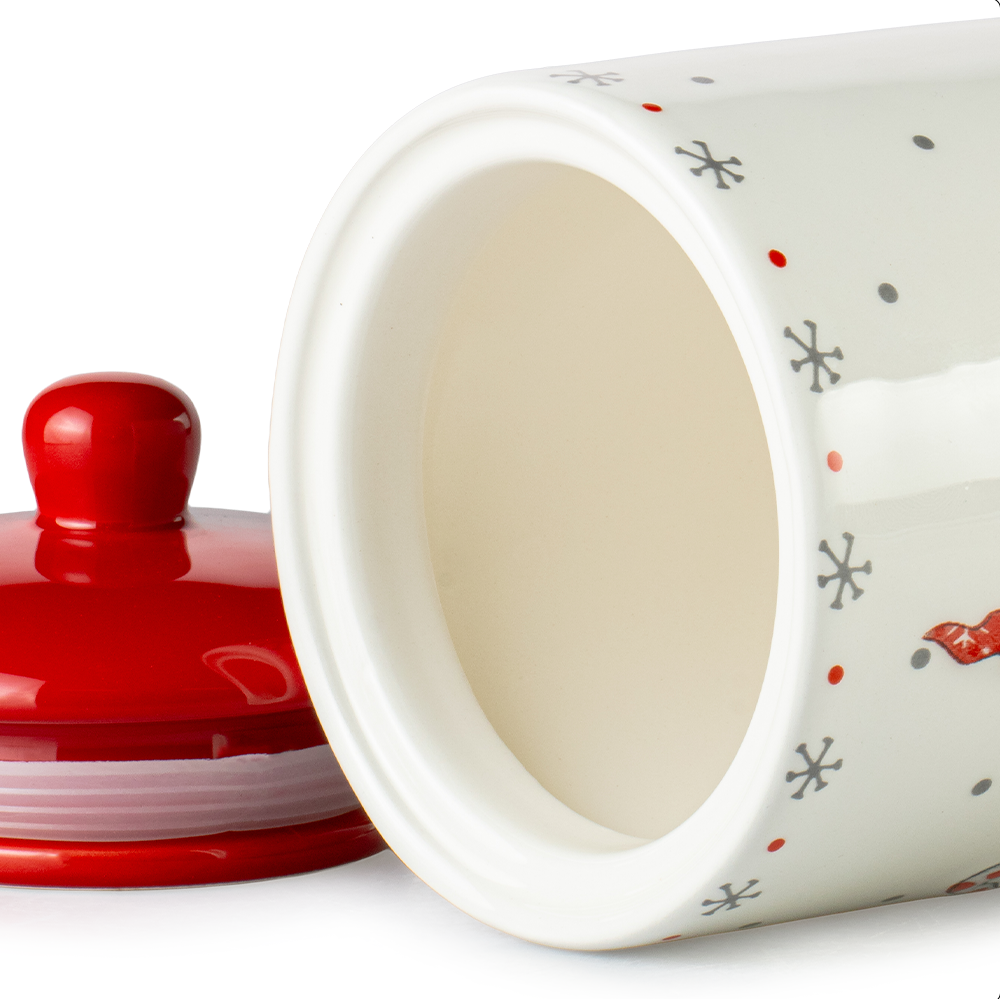 Las medidas cilíndricas de este galletero son perfectas para cualquier espacio: 10 cm de diámetro y 14 cm de alto. Con una generosa capacidad de 500 ml, ofrece amplio espacio de almacenamiento. El detalle clave es su tapa en color rojo que incluye una goma interior de sellado. Esta goma crea un cierre hermético, vital para mantener el contenido fresco por más tiempo.