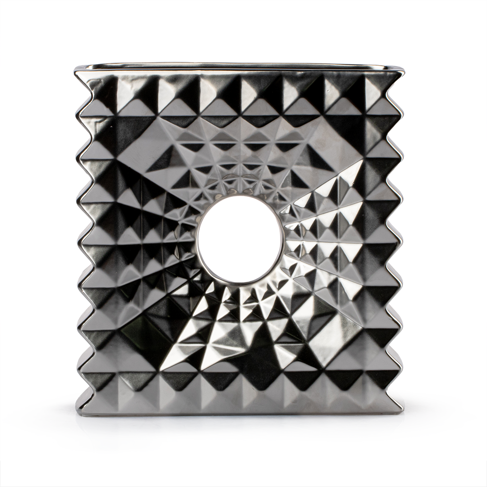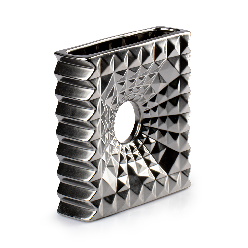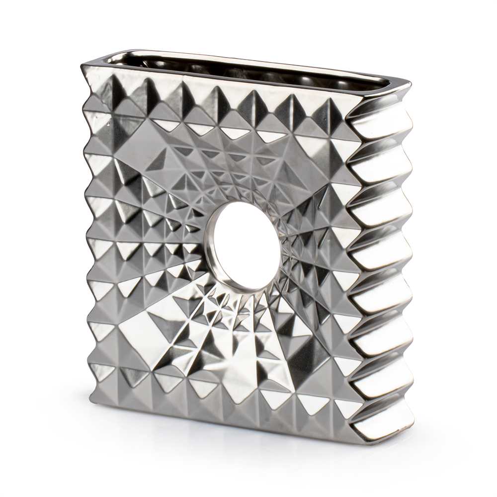 Fabricado en cerámica plateada, este jarrón refleja calidad y durabilidad, además de aportar un brillo metálico que realza cualquier ambiente. Sus medidas de 7 cm de largo, 24 cm de ancho y 24 cm de alto lo hacen perfecto para mesas auxiliares, consolas, repisas o como centro de mesa en espacios amplios. Gracias a su tamaño y diseño, se puede usar con flores naturales o artificiales, o simplemente como elemento decorativo independiente. El acabado plateado lo hace versátil para combinar con distintos estilos, desde minimalismo moderno hasta ambientes clásicos y elegantes. Su diseño cuadrado transmite orden y equilibrio, mientras que el círculo central añade dinamismo y fluidez visual, logrando una pieza armónica y llamativa.