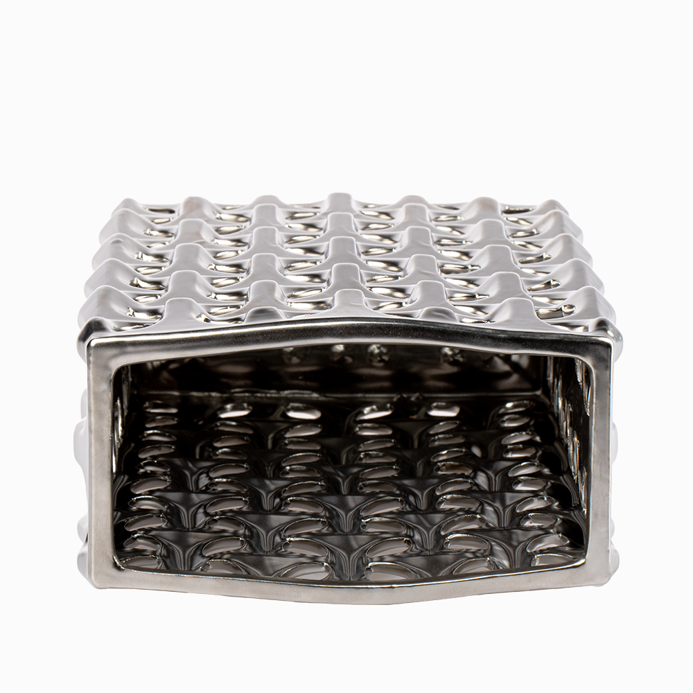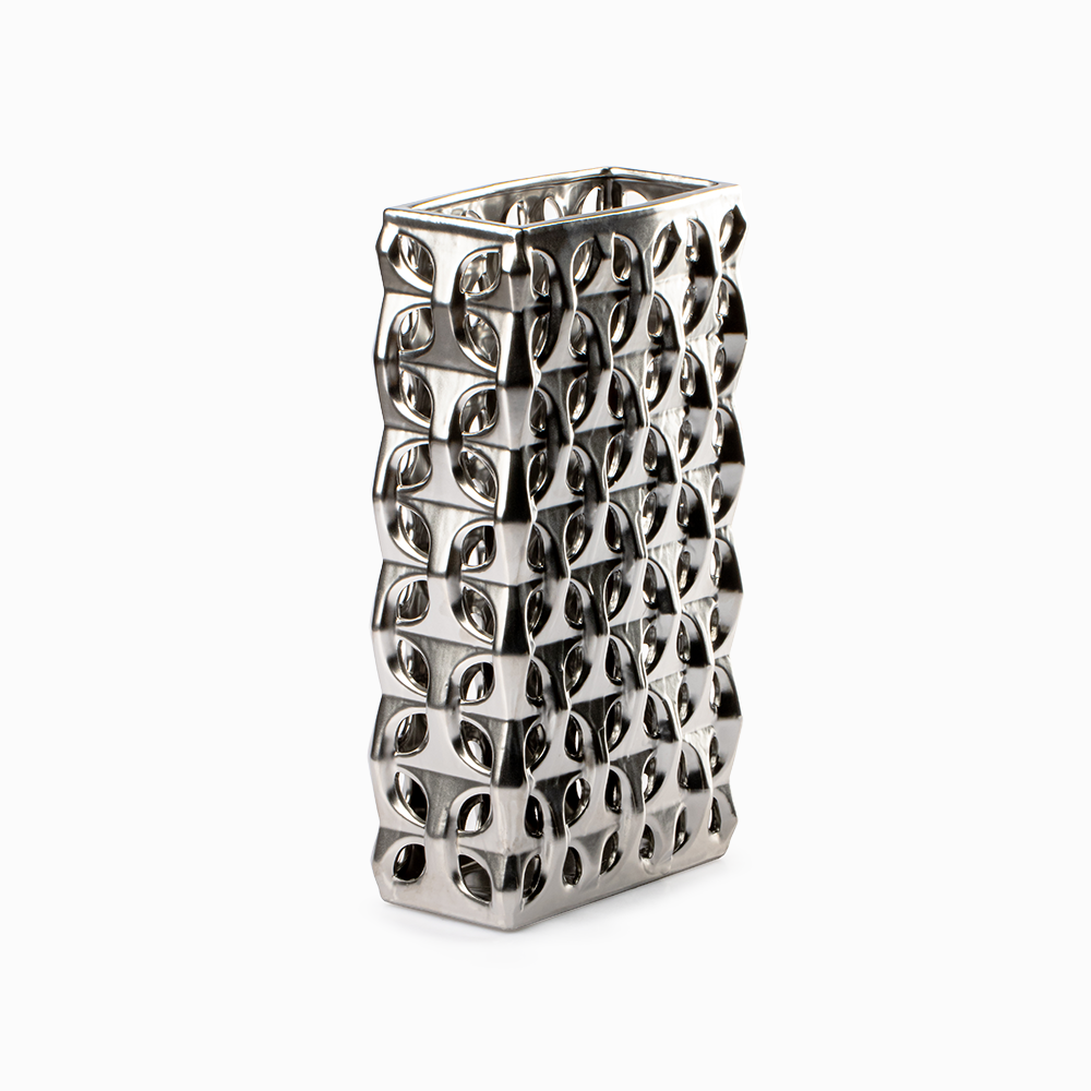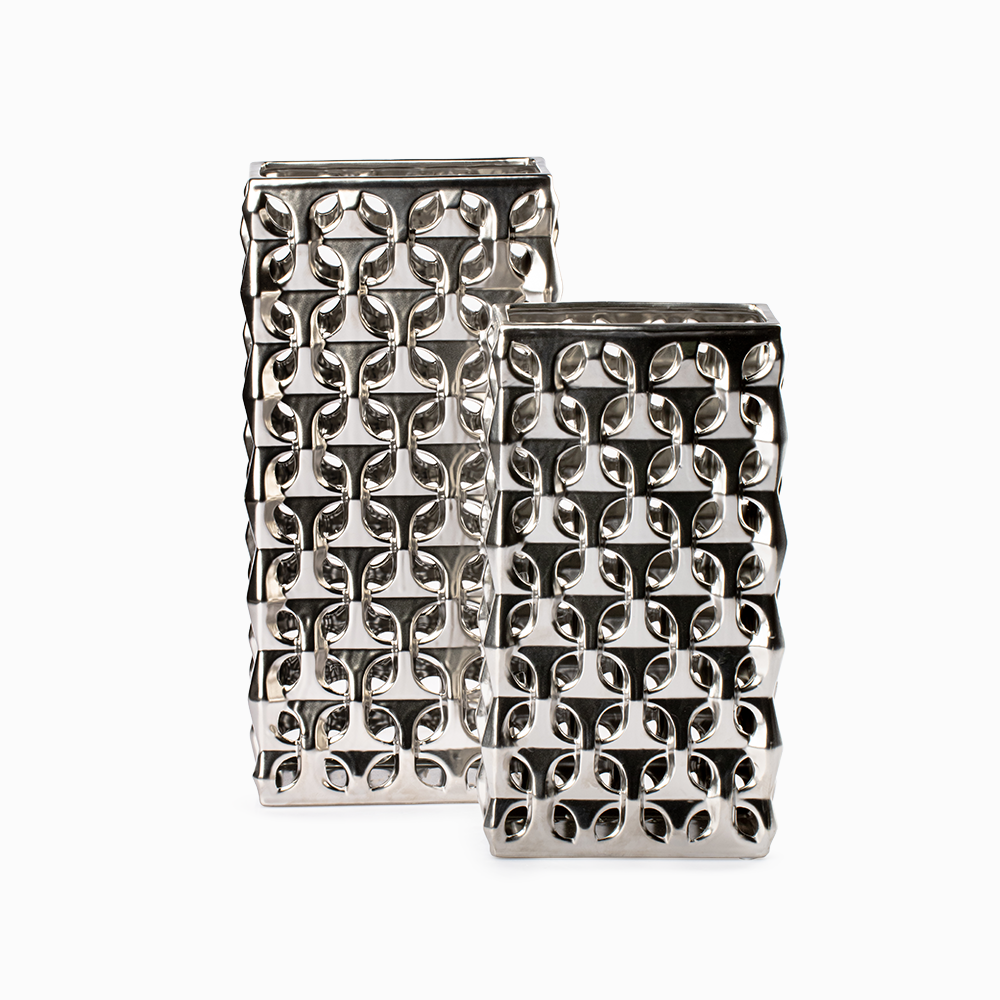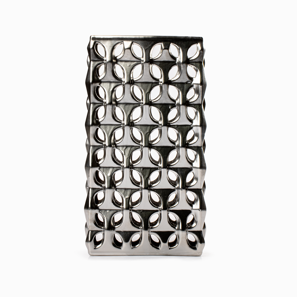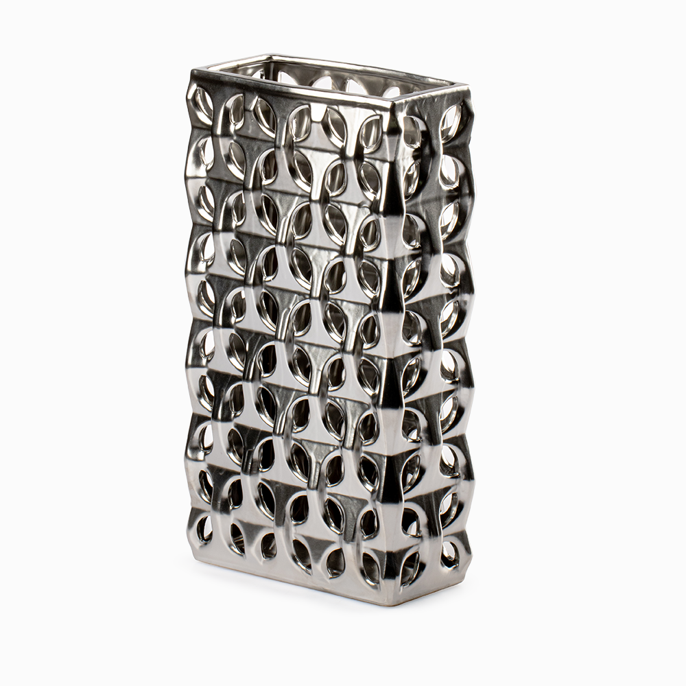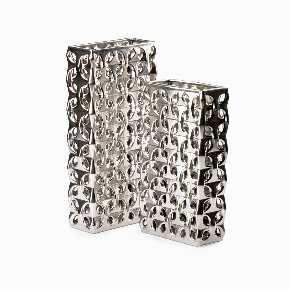 El acabado metalizado en tono plateado del Jarrón Stella Plateado es uno de sus mayores atractivos. Este detalle no solo aporta luminosidad, sino que también transmite lujo y distinción. Sus medidas de 20 cm de ancho, 10 cm de largo y 35 cm de altura lo hacen perfecto para colocar sobre mesas auxiliares, repisas o consolas, ofreciendo siempre una presencia destacada.