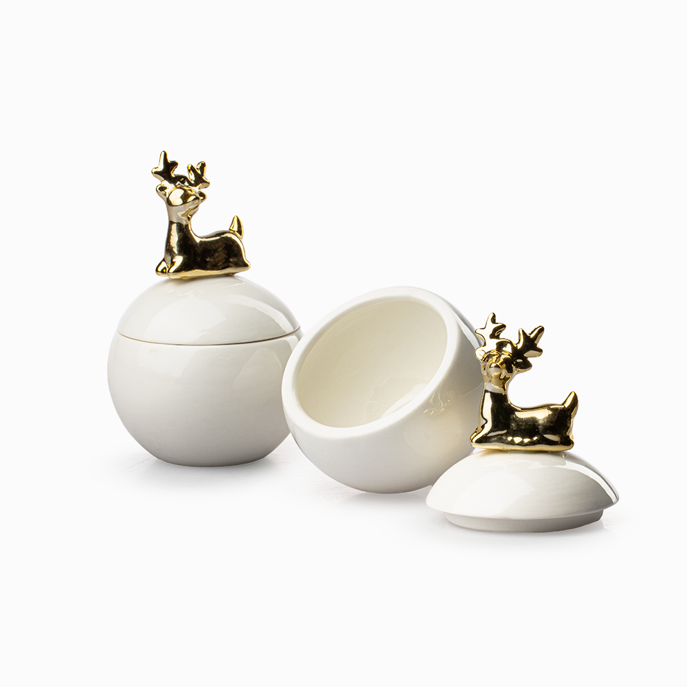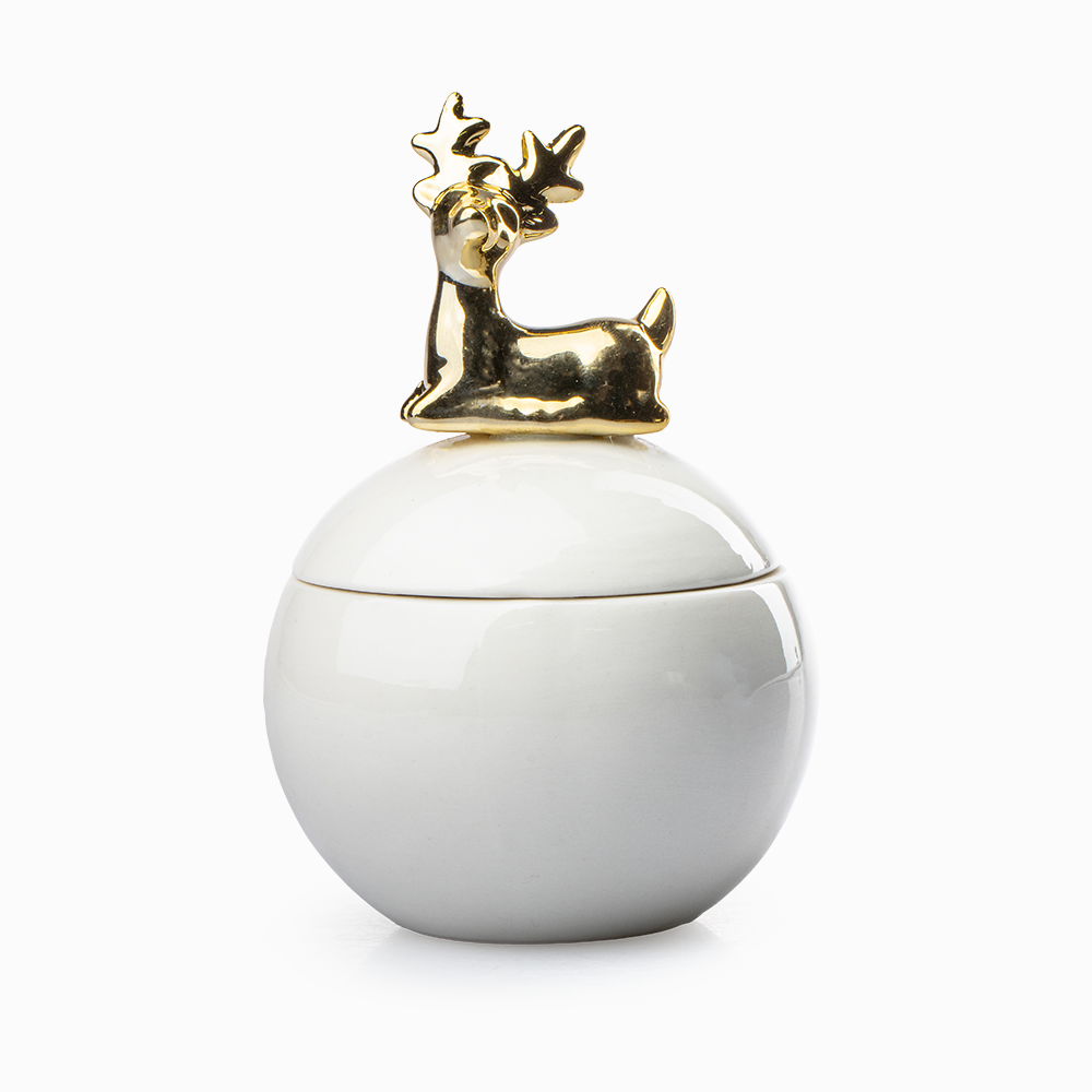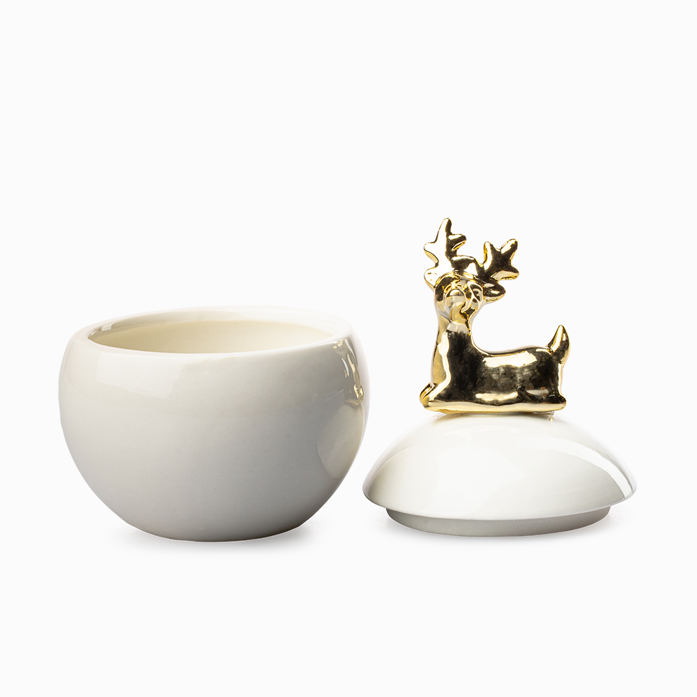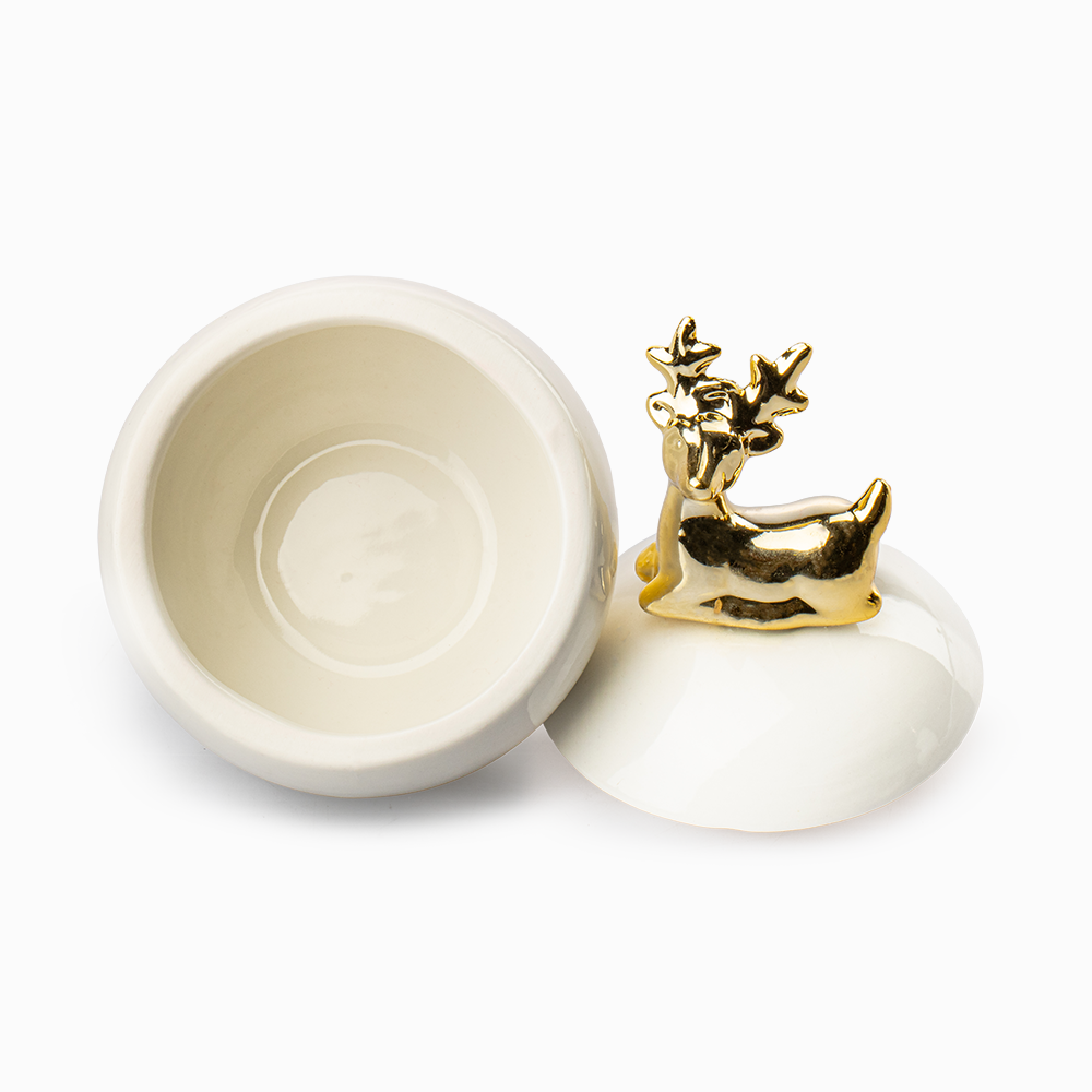 El Joyero Reno Rudolph Dorado Porcelana Love And Lemons es una pieza que combina elegancia, funcionalidad y encanto navideño en un solo diseño. Su figura de reno dorado sobre una base circular blanca transmite un aire festivo y sofisticado. Es perfecta para decorar tu tocador, buró o repisa. Además, mantiene tus joyas organizadas con estilo.