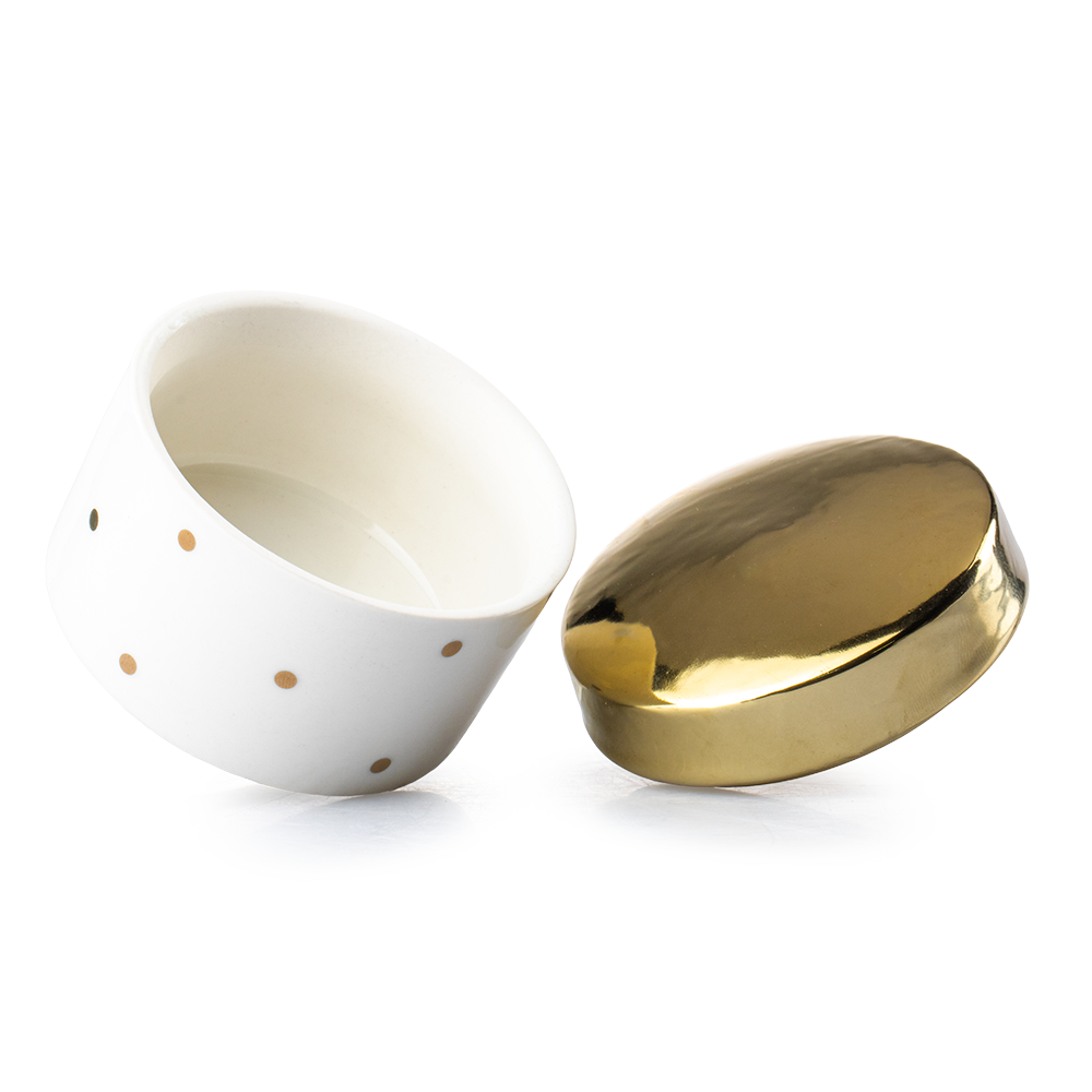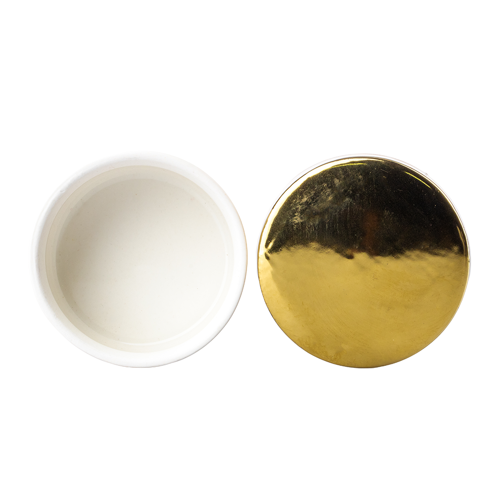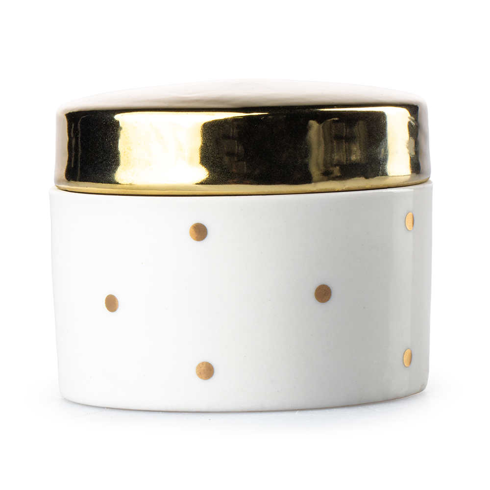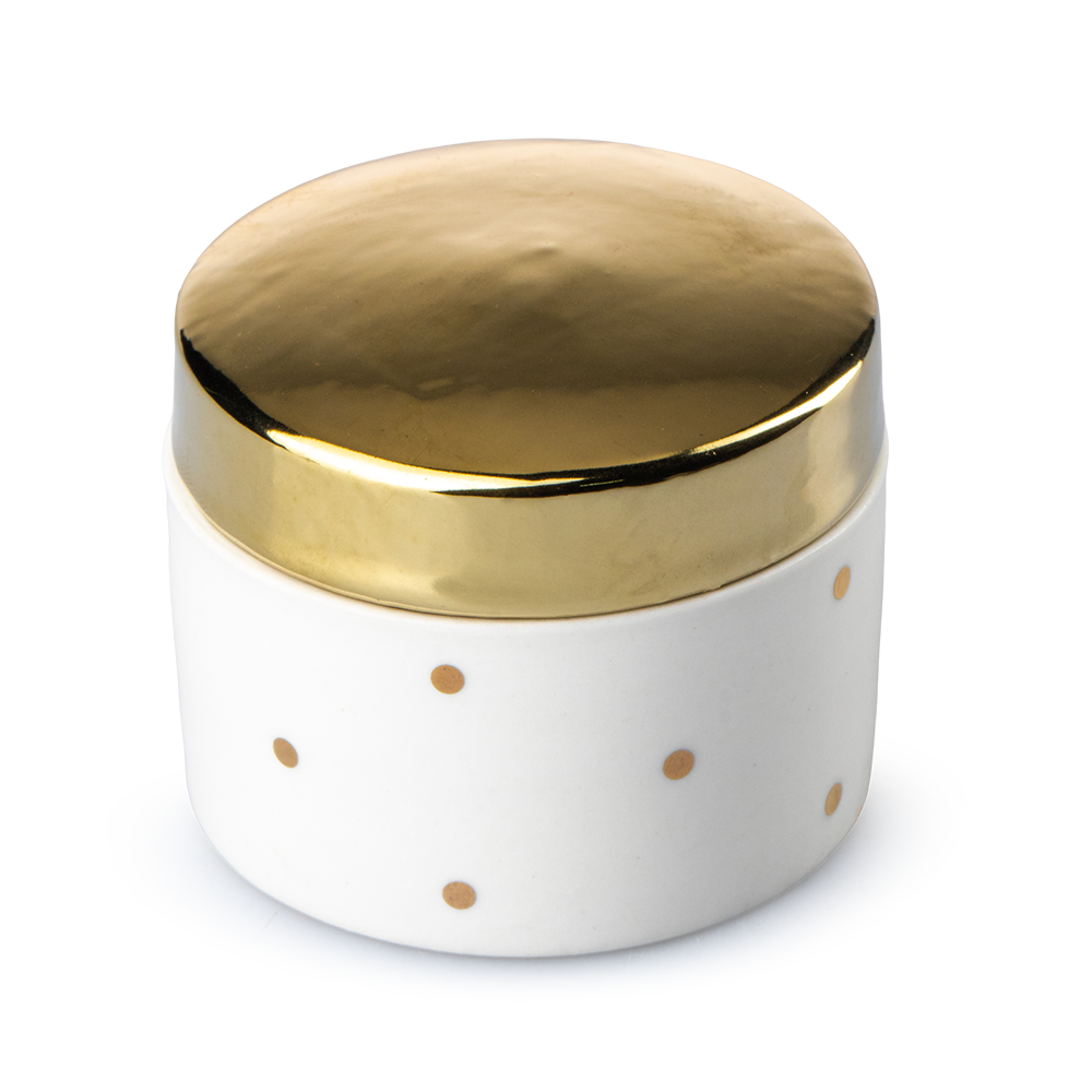 Su diseño contemporáneo presenta una base blanca con detalles dorados, incluyendo puntos decorativos y una tapa dorada que aporta lujo y distinción a cualquier espacio. Este joyero compacto, con 7cm de diámetro y 5.8cm de altura, es perfecto para almacenar anillos, pendientes, collares y otros accesorios pequeños.
