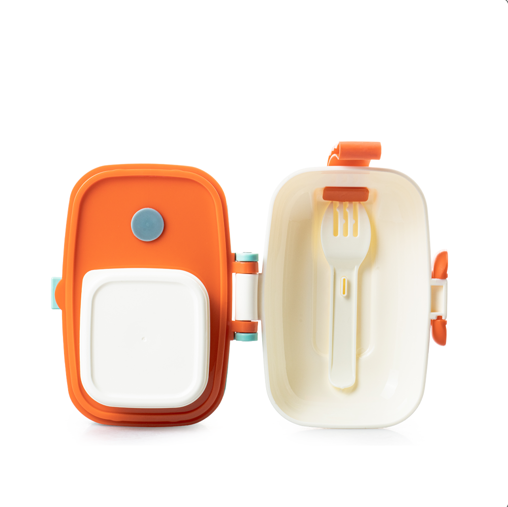 La Lonchera Ositos Azul 450ml Plástico Nuvó ofrece organización 4 en 1, eliminando la necesidad de múltiples contenedores. La estructura interna es modular y permite separar completamente los sabores. El kit incluye cuatro accesorios desmontables: divisor interior, un contenedor con tapa para salsas y un tenedor de plástico.