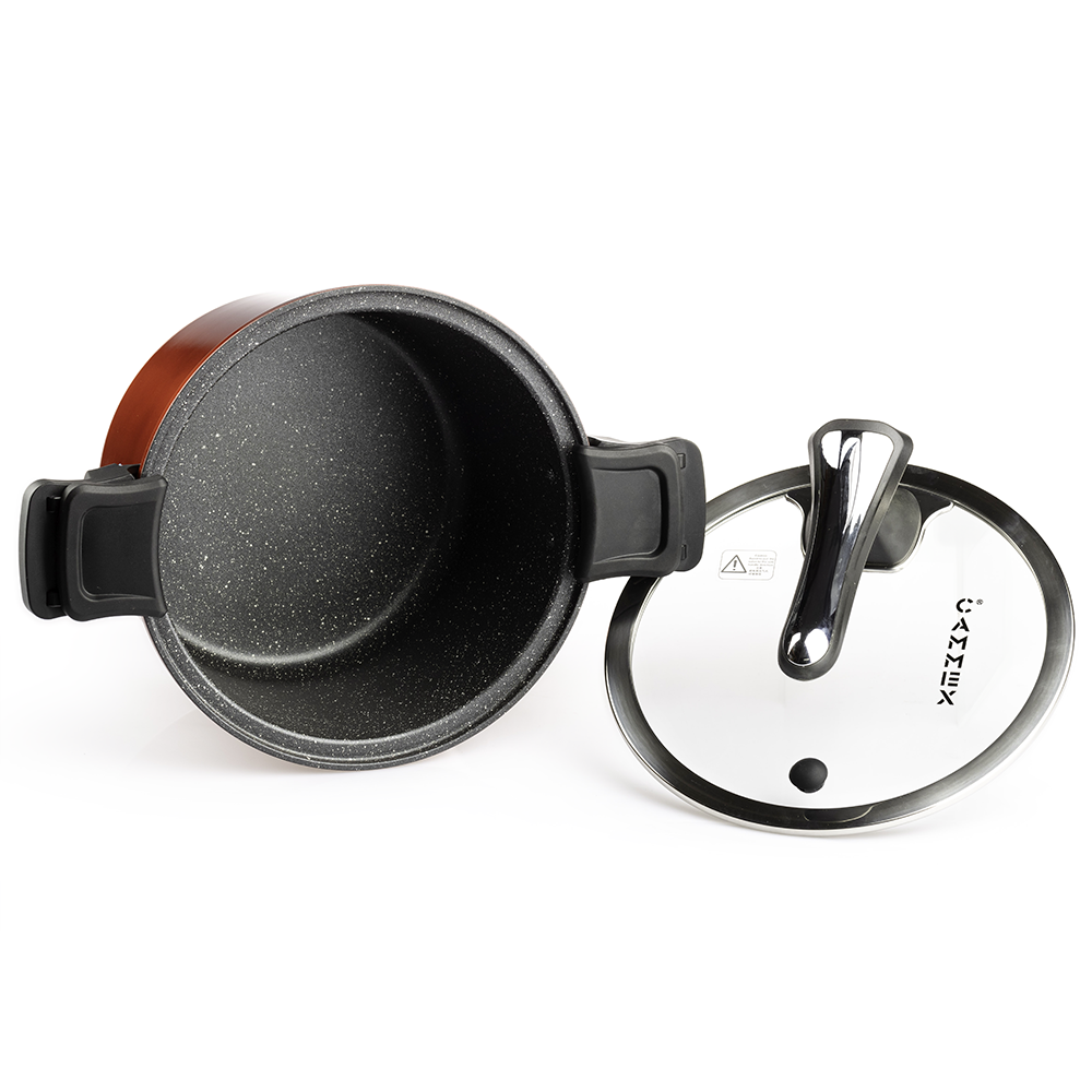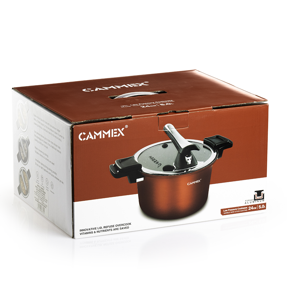 Olla de baja presión marca Cammex es una innovadora combinación entre cazuela tradicional y olla a presión que facilita una cocción fácil, segura y saludable. Acelera el proceso de cocción de los alimentos, conservando sus nutrientes, y es ideal para cocinar alimentos delicados como espárragos y gambas. Además, ofrece la conveniencia de una apertura inmediata para añadir ingredientes en cualquier momento. Compatible con todo tipo de cocinas, incluida la inducción, garantiza una rápida conducción térmica y un calentamiento uniforme para mantener la humedad y el sabor de los alimentos.