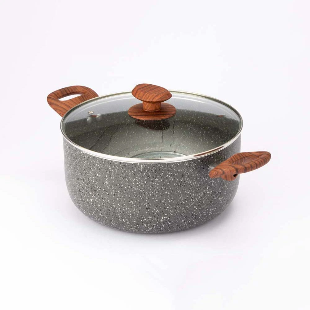 Disfruta de los beneficios de cocinar saludable sobre la olla Stone de Lamex, recubrimiento con 7 capas de antiadherente Stone 360°, asas confort touch ergonómicos y tipo madera, y tapa de vidrio templado con escape para vapor. Incluye: olla