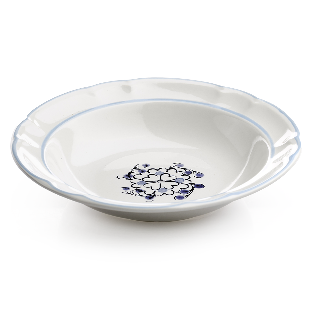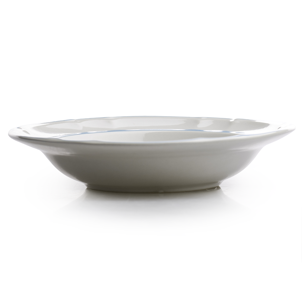 También, el borde ligeramente elevado y su forma honda facilitan servir sin derrames, mejorando la experiencia al momento de manipularlo. Mientras tanto, su estética se adapta con facilidad a vajillas lisas o estampadas, gracias a su combinación de blanco neutro con azul tenue.