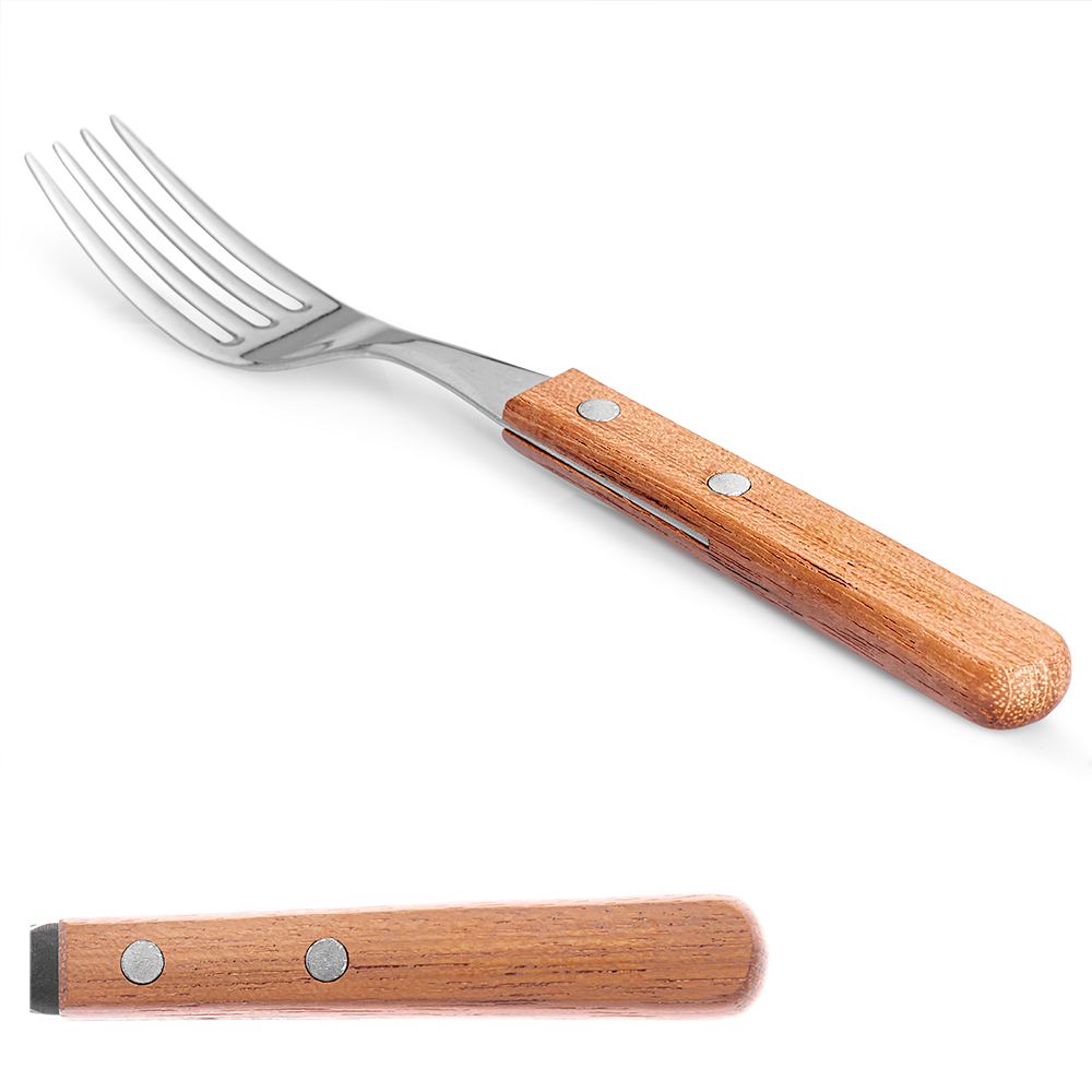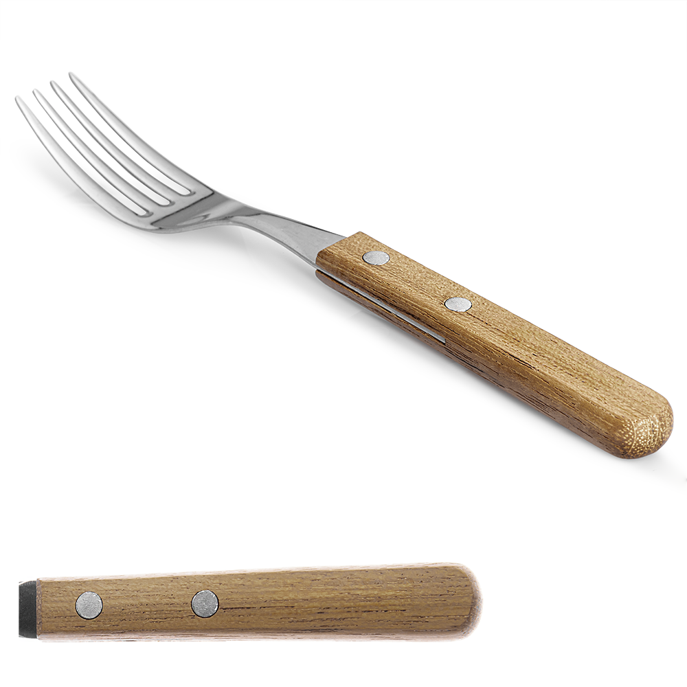 Su mango ergonómico de madera natural color café aporta un toque cálido y estético, ideal para quienes desean una presentación más acogedora y natural en su mesa. La textura del mango no solo es visualmente atractiva, sino que también proporciona un agarre cómodo y seguro. Cada detalle está pensado para que el tenedor se sienta firme, equilibrado y agradable en la mano.