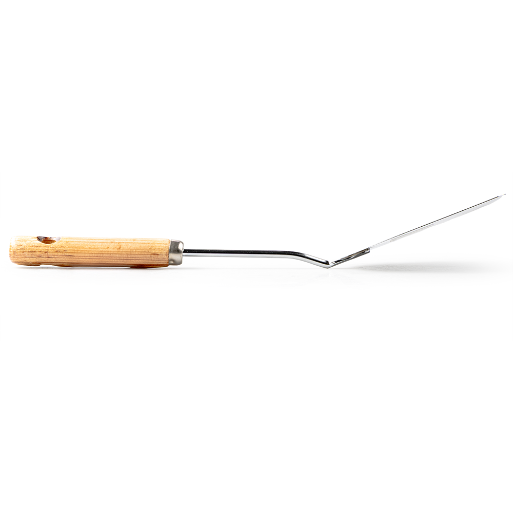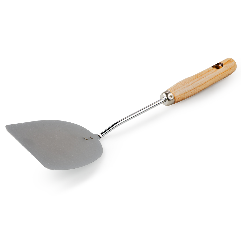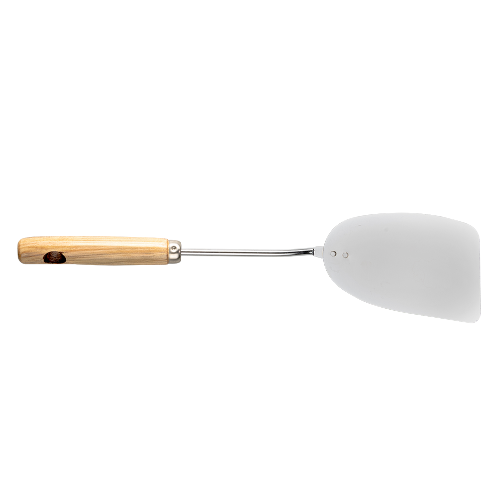 El cuerpo del volteador está fabricado en acero galvanizado de alta calidad, lo que garantiza resistencia a la corrosión, durabilidad y facilidad de limpieza. Su superficie lisa y amplia permite levantar y girar alimentos de forma precisa, sin dañarlos, ideal para presentaciones cuidadas y cocción uniforme.