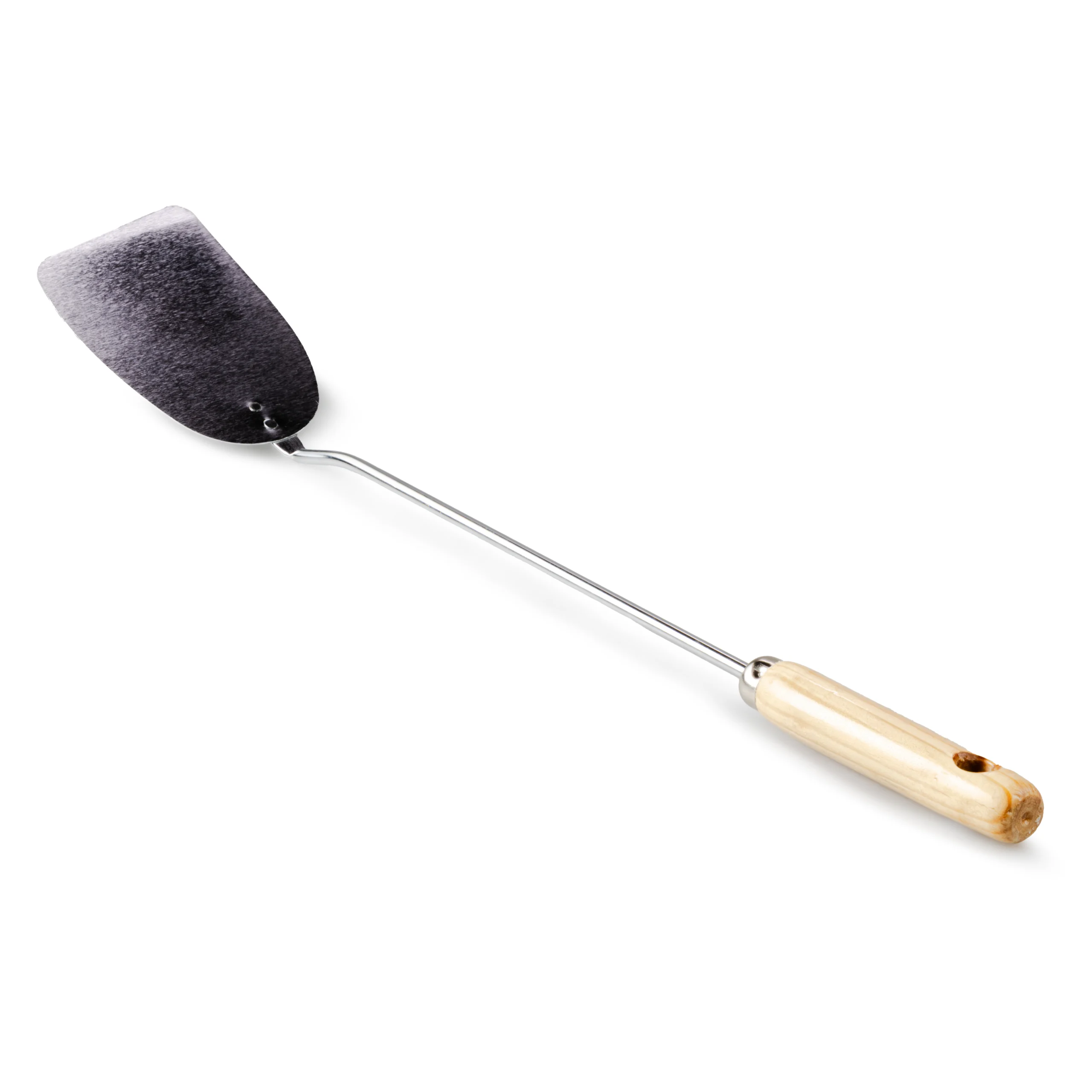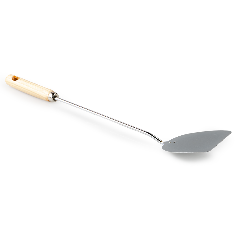 El cuerpo del volteador está fabricado en acero galvanizado de alta calidad, lo que garantiza resistencia a la corrosión, durabilidad y facilidad de limpieza. Su superficie lisa y amplia permite levantar y girar alimentos de forma precisa, sin dañarlos, ideal para presentaciones cuidadas y cocción uniforme.